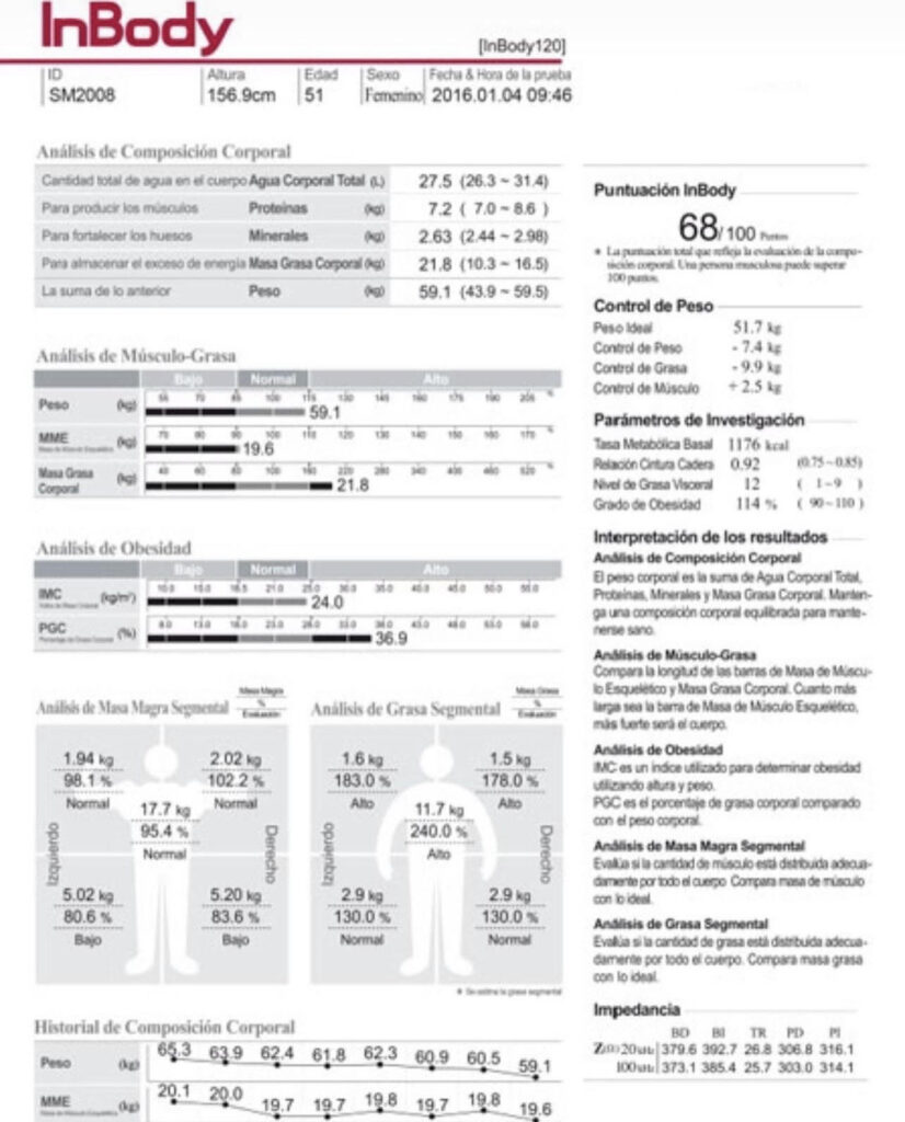 - Evaluación con bioimpedancia In Body la cual determina: % de grasa corporal, musculatura, agua corporal, etc.